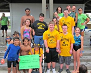The Grand Lakes Gators Swim Team, West Houston Aquatic League’s Division I champions, recently hosted a Swim-a-Thon with proceeds benefiting the Katy Wolf Pack. The Katy Wolf Pack is a Special Olympics Texas team, which offers softball, basketball, track and field, bocce ball, golf, bowling, and aquatics for individuals with intellectual disabilities who live in Katy and surrounding areas. Grand Lakes Gators swimmers collected pledges and swam up to 100 laps each, raising $1,500 to donate to their fellow Katy athletes to assist with the purchase of equipment and operating expenses. Wolf Pack athletes came to cheer on their Gator friends at the event. The Gators’ top fundraisers and coaches presented the Wolf Pack with a large check at the team’s end-of-the-year party.